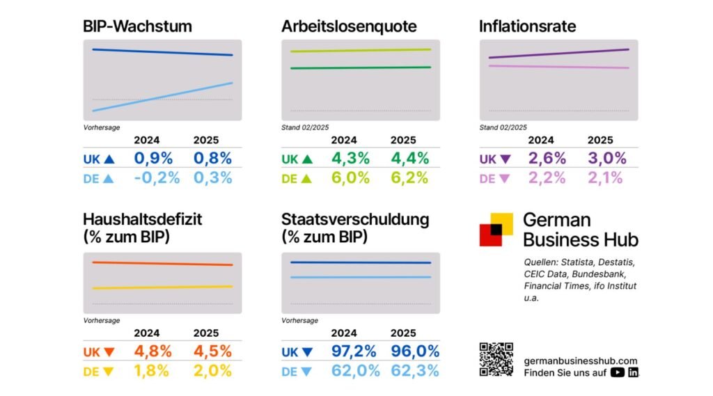 Die wirtschaftliche Entwicklung in Deutschland und Großbritannien zeigt weiterhin deutliche Unterschiede. Während Großbritannien ein moderates Wachstum verzeichnet, bleibt Deutschland wirtschaftlich hinter den Erwartungen zurück. BIP-Wachstum Das britische Bruttoinlandsprodukt (BIP)